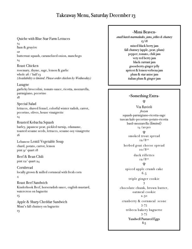 On to the main menu. A Lebanese inspired lentil soup to keep you warm - French lentils, swiss chard, with vegetables, 7 spice mix and lots of lemon. Warming, earthy and bright! The “other salad” is roasted kobacha squash, barley, japanese pear, pickled turnip, edamame, toasted sesame seeds over lettuces with a zippy sesame-soy dressing. Classic lasagne is back. tomato sauce, garlicky broccolini, ricotta, mozzarella, parmigiano, pecorino. We are roasting Kinderhook beef rare for our sandwich on baguette, with creamy horseradish sauce, english mustard and watercress. Also, Mimi’s wonderful fall chutney topping off a simple yet supremely satisfying sandwich of crunchy sliced apple, sharp cheddar on baguette. And as always, roast chicken, bean & beef chili, cornbread. For something sweet, spiced apple crumb cake, triple ginger cookie and brown butter chocolate chunk cookie. Biscuits and frittata for special order.